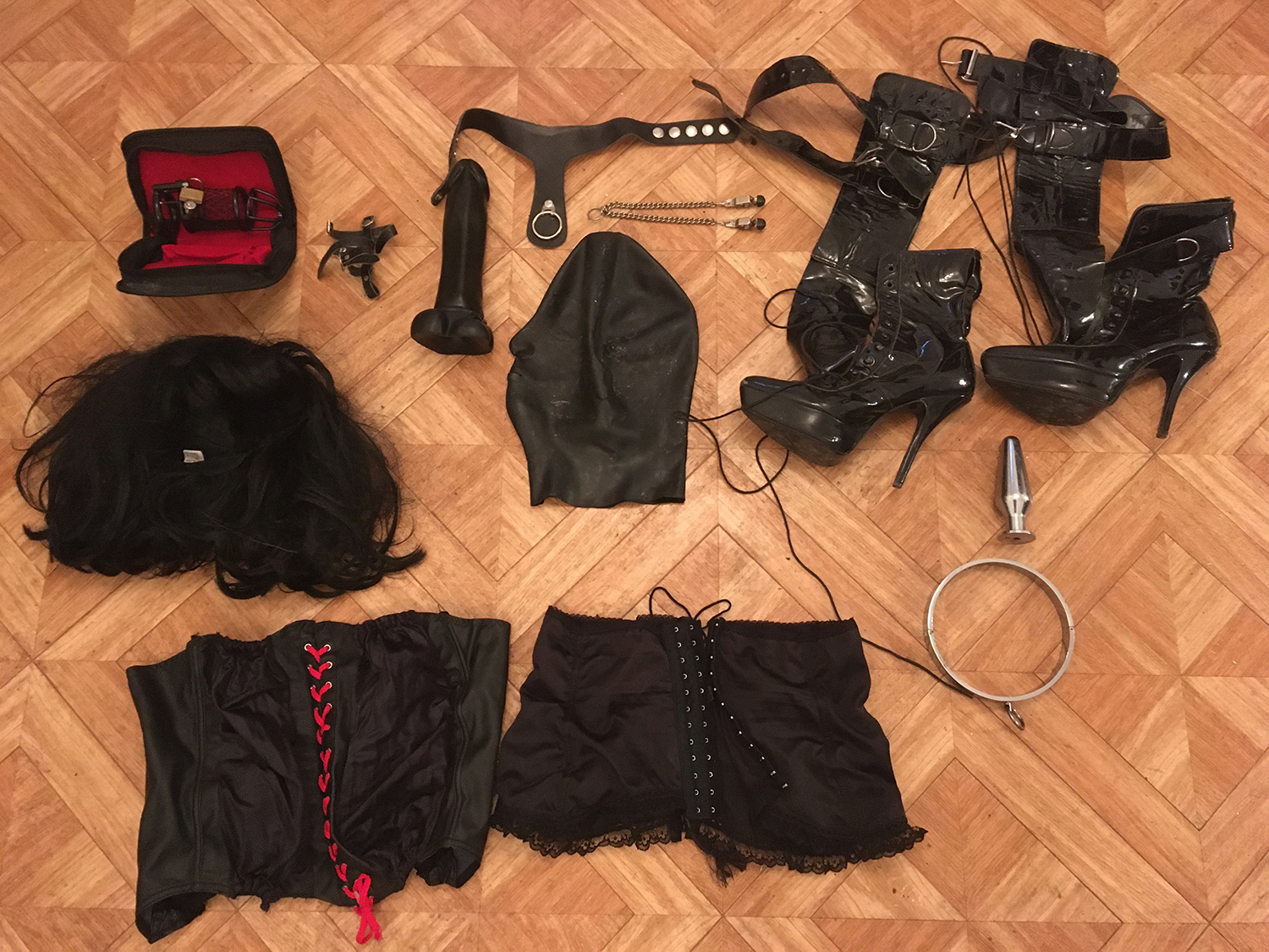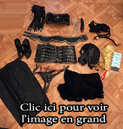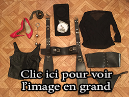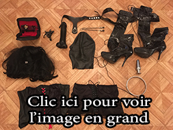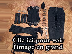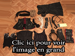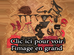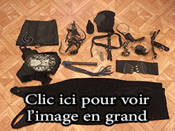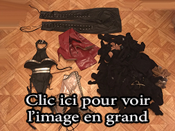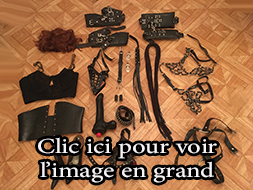 Lot 09: 1 perruque courte, 1 corset dentelle taille 40, 1 corset cuir pique a l'interieur taille 40, 1 paire d'escarpin homme cuir verni taille 43, 1 string taille 38 vinyle, 1 gros gode, 1 ceinture cuir et clous, 1 ecarteur de bouche, 1 paire de pinces japonnix, 2 petit poids, 1 cache yeux cuir noir et rouge en cuir, 1 contrainte corps en cuir et anneaux, 1 ensemble en cuir et anneau taille 38, 4 petite corde noir, 1 martinet en latex, 4 superbe menotte fetters tres solide et agreable pour suspension.