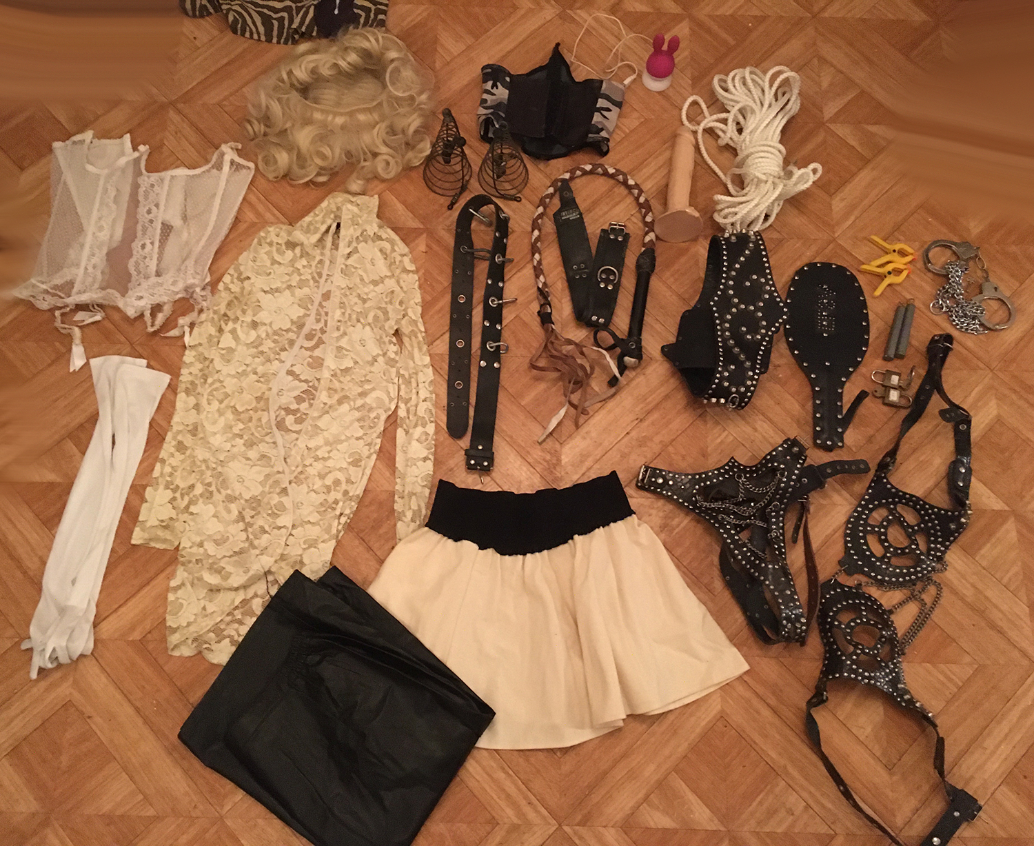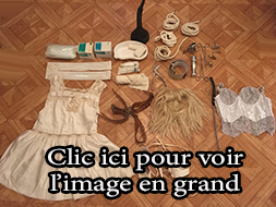 Lot 02: 1Corset blanc dentelle taille 40, 1 perruque blonde, 1 robe blanche dentelle taille S/M, 1 ceinture cuir, 1 corset petite taille, 1 martinet, 1 collier latex, 1 ceinture cuir et clous epaise, 1 paddle, 1 corde blanche, 1 gode, 2 poids, 2 pinces, + 2 pince en triangle, 1 paire de menotte, 2 cadenas, 1 paire de gant blanc, 1 jupe courte blanche, 1 ensenble cuir clous et chaine, 1 jupe en cuir longue taille 40/42, 1 vibro rose forme de lapin recharge usb