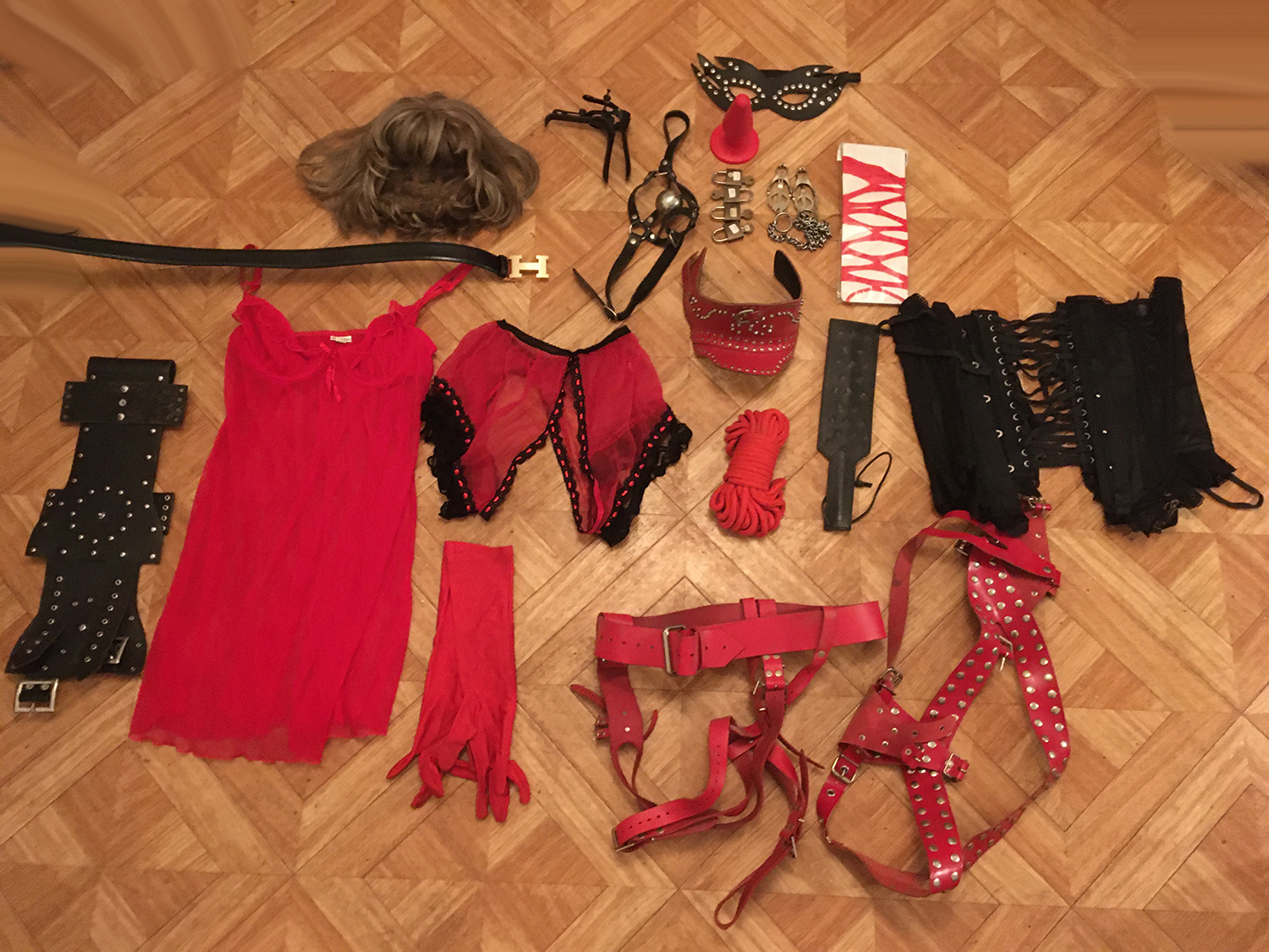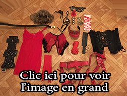 Lot 03: 1 perruque courte, 1 speculum noir, 1 masque cuir noir, 1 gode rouge, 1 paire de bas rouge, 4 cadenas, 1 paire de pince japonnix, 1 baillon boule et cuir, 1 ceinture en cuir noir, 1 lingerie transparente rouge taille unique, 1 culotte dentelle rouge ouverte taille 38/40, 1 haut collier cuir rouge, 1 paddle a pique, 1 corset satin noir taille 40, 1 corde rouge, 1 paire de gant rouge, 1 ceinture hermes cuir noir, 1 ensenble cuir rouge.