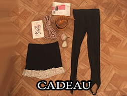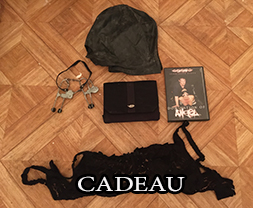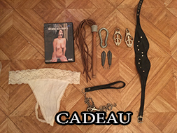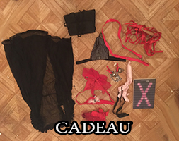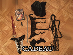 CADEAU: 1 DVD SM, 1 porte jartelle noir, 1 collant resille et vinyle noir, 1 paire de bas noir, 1 string noir et blanc dentelle taille 38, 1 chaine pour pince, 4 petite pinces hard en cuir rouge, 1 petit collier de chien en cuir noir