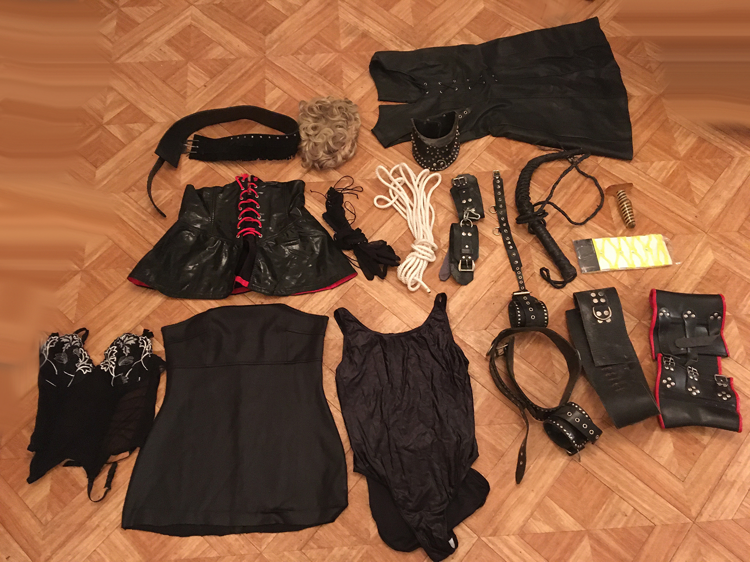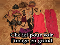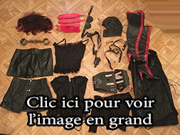 Lot 05: 1 perruque courte, 1 ceinture noir en dain, 1 collier taille haute cuir et clous, 1 robe cuir taille 38, 1 jupe vinyle noir et rouge taille 38, 1 paire de gant noir, 1 corde blanche, 1 paire de menotte cuir, 1 collier fin cuir, 1 martinet en cuir, 1 paire de bas jaune, 1 gode, 1 corset noir et dentele blanc taille 38, 1 jupe elastique noir taille 40 1 body noir taille unique, 1 superbe ceinture de contrainte pour poignet en cuir noir et clous, autre ceinture de contrainte noir a boucle reglable, 1 tres beau corset en cuir et rouge cuir taille 38.
