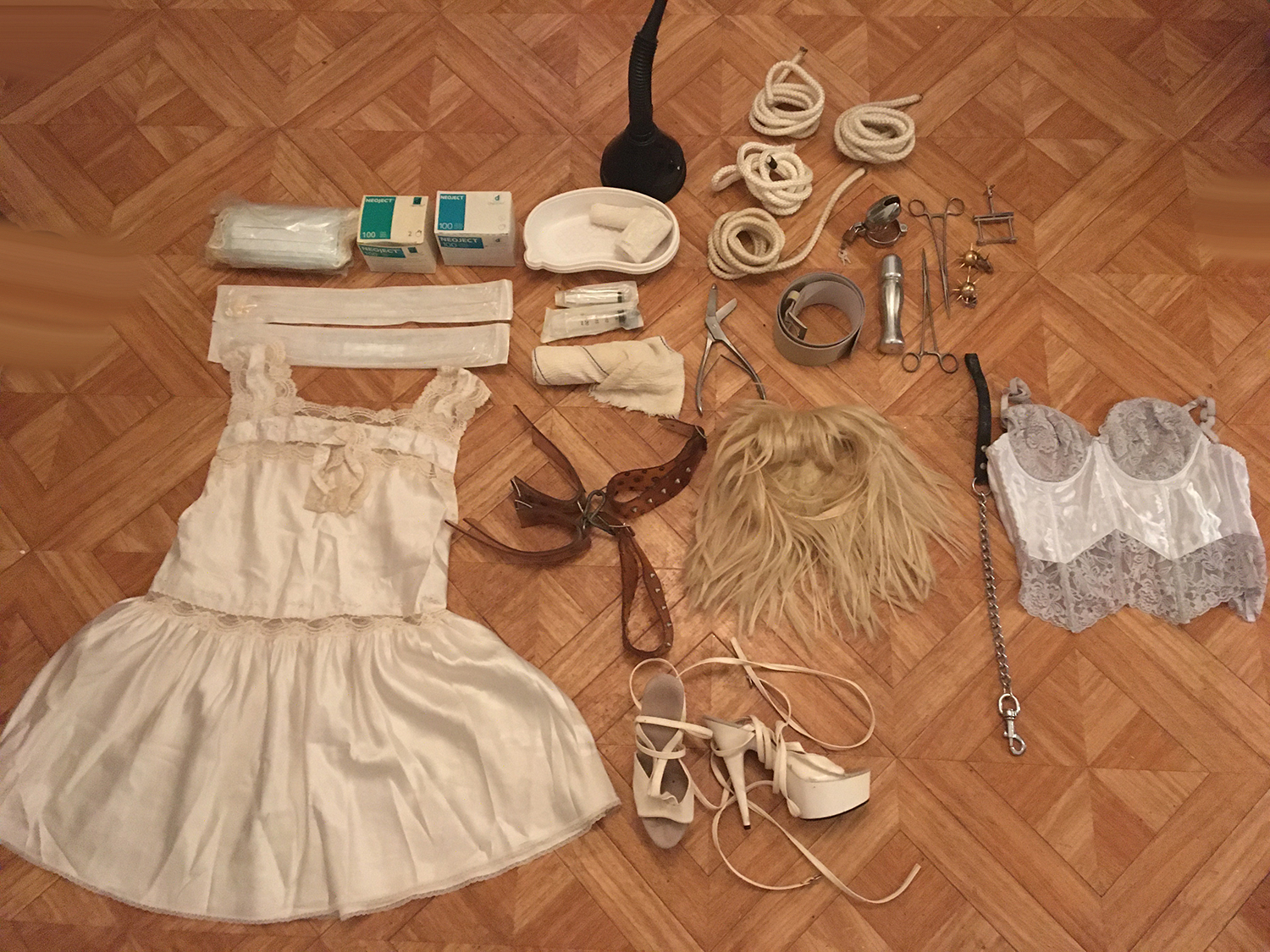 Lot 06: 1 perruque courte blonde, 2 boites de 200 aiguilles 0.60X30mm, bandage plus le ciseau a decouper, 4 petite corde blanche, 1 ceinture blanche, 1 robe satin blanc taille 40, 1 paire de menotte en plastique cheville et poignet, 1 paire de chaussure blanche 37, 1 corset blanc taille 38, 1 laisse, 1 magnifique gode en acier, 2 pinces medical, 2 poids, 1 serre bite, 1 cage de chasteter en acier, 2 seringue, 2 sonde uretrale, env 50 masque de protection, 1 urinoir plastique noir.