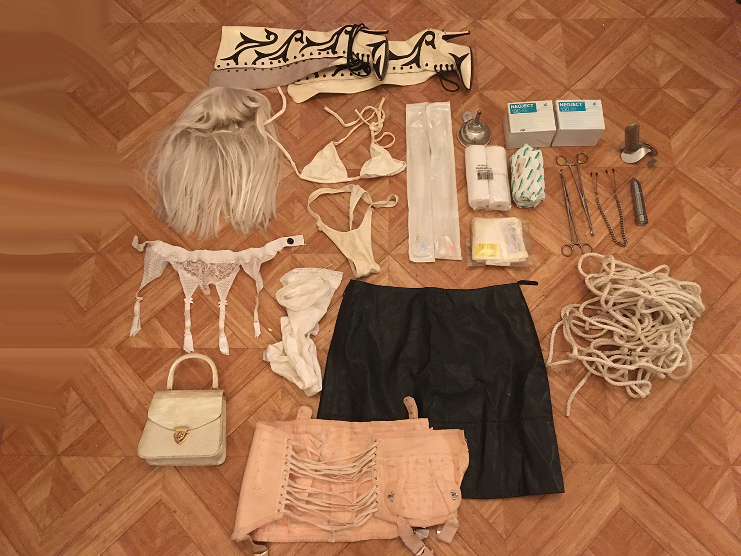 Lot 07: 1 perruque blonde, 1 ensemble vinyle blanc taille 38, 2 sonde uretrale, 2 boites de 200 aiguilles 0.60X30mm, bandage, 1 urinoir metal, aiguille de couture, 1 corde blanche, 1 paire de bottine phylea taille 37, 1 porte jartelle blanc, 1 paire de bas blanc, 1 jupe cuir noir taille 44, 1 corset d'epoque rose tres bon etat taille 38, 1 paire de pince, 1 paire de pince medicale hard, 1 gode, 1 speculum, 1 sac en ivoir blanc