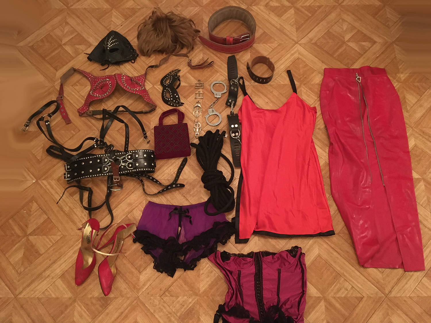 Lot 08: 1 perruque courte, 1 cagoule cuir noir, 1 ceinture cuir rouge, 1 soutien gorge cuir rouge a pique a l'interieur, 1 petit sac velour rouge carmin, 1 masque cuir noir, 1 paire de pince japonnix, 1 paire de pinces serre tetons. 1 paire de menotte, 2 menotte poignet cuir noir plus le collier, 1 corde noir, 1 lingerie satin rouge taille 40/42, 1 culotte lingerie violette ouverte taille unique, 1 corset violet taille 38, 1 longue jupe rouge en latex taille 38, 1 paire escarpin rouge homme taille 43, 1 ceinture contrainte cuir et clous.