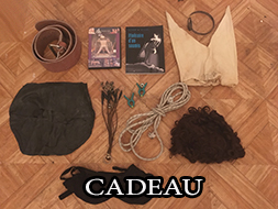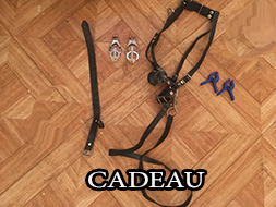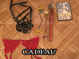 CADEAU: 1 DVD sm, 4 pinces bleue, 4 pinces rouge, 1 chaine pour pince, 1 masque cuir noir, 1 ouvre bouteille gode.