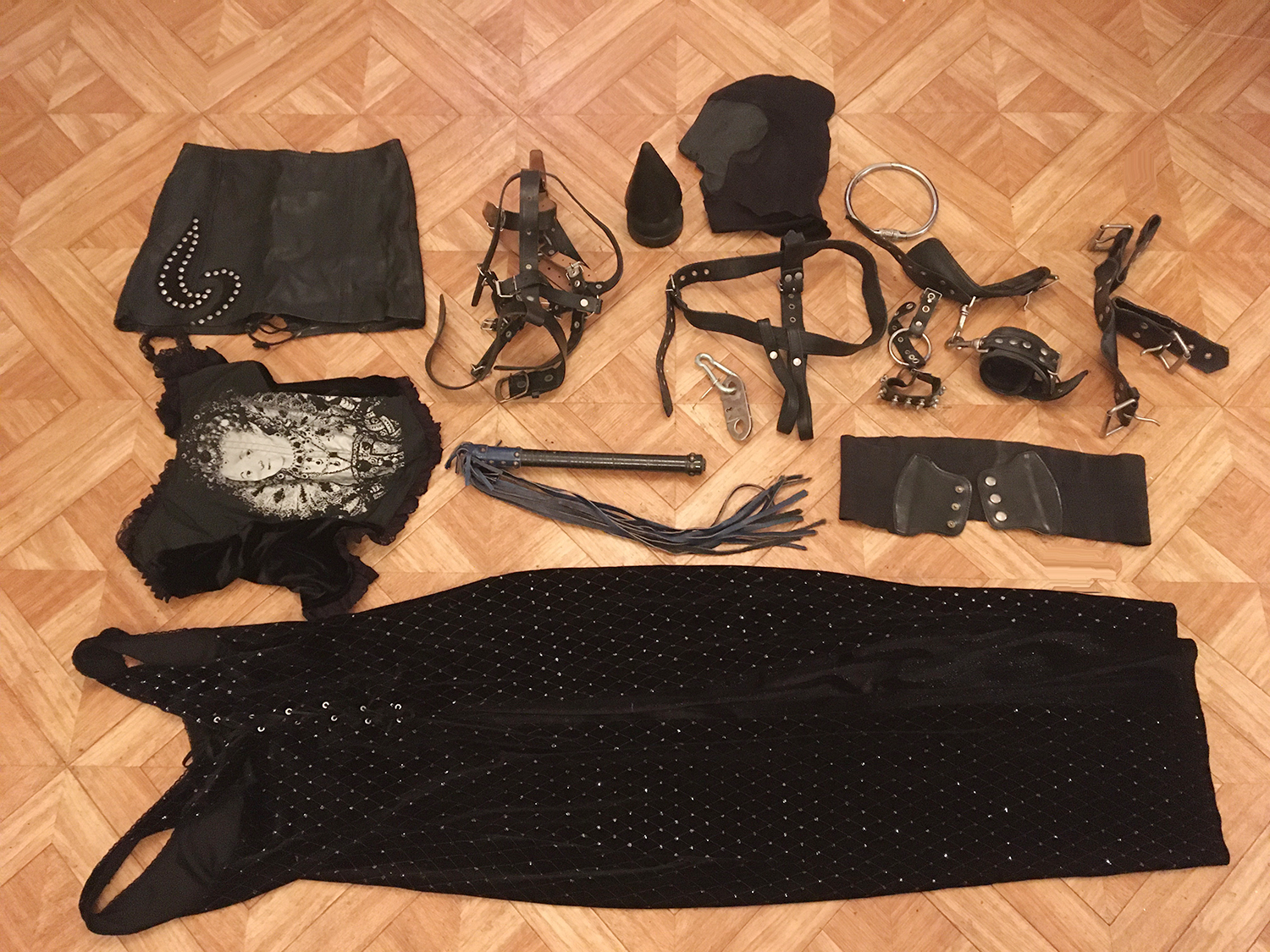 Lot 13: 1 petit haut resille noir taille unique, 1 cagoule cuir noir et marron, 1 plateau crome pour billes, 1 paire de menotte cheville cuir et rouge, 1 cage de chasteter cuir noir et metal, 1 petit speculum crome, 1 collier cuir noir et anneau, 1 BUTTPLUG ALUMINIUM (vendu 130 euros chez Demonia), 1 contrainte sexe cuir noir, des contrainte poignet en cuir noir, 1 soutien gorge fait maison a pique a l'interieur, 1 ceinture vinyle noir, 1 paire de mule homme cuir noir taille 41, 1 jupe cuir noir taille 44, 1 robe vinyle taille 44, 1 cockring acier assez lourd, 1 collier d'epoque en metal (( collector))