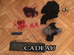 CADEAU: 1 petite pochette satin noir, 3 string fantaisie rouge rose et noir, 1 livre sexe sm, 1 paire de pince rouge, 1 petit chapeau rouge, 1 martinet a customisé, 1 nuisette voile noir taille unique.