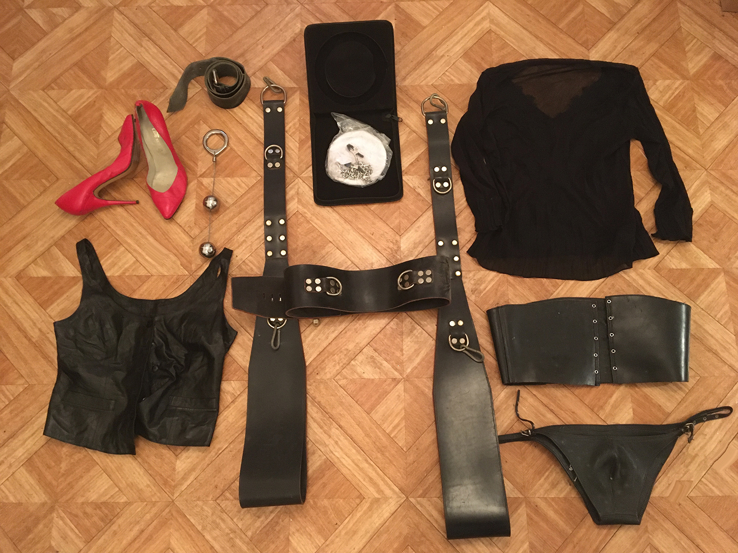 Lot 12: 1 paire d'escarpin cuir rouge pour homme taille 43, 1 ceinture cuir noir, 1 gillet cuir noir taille 38, 1 boule de gaicha crome, 1 petit haut noir taille 40, 1 corset cuir noir a pique a l'interieur taille 38/40, 1 slip reglable cuir noir a pique a l'interieur, 1 magnifique collier neuf jamais servi a pince en crome metal avec sa boite, 1 sling de suspension tres solide en cuir noir.