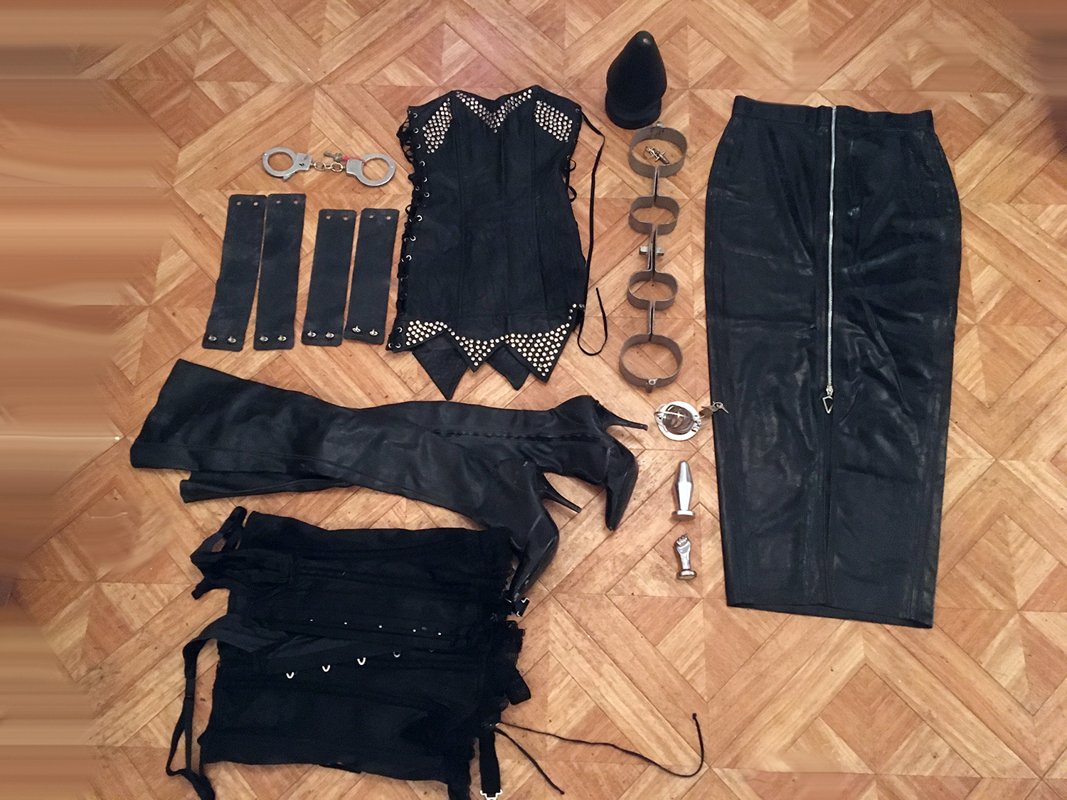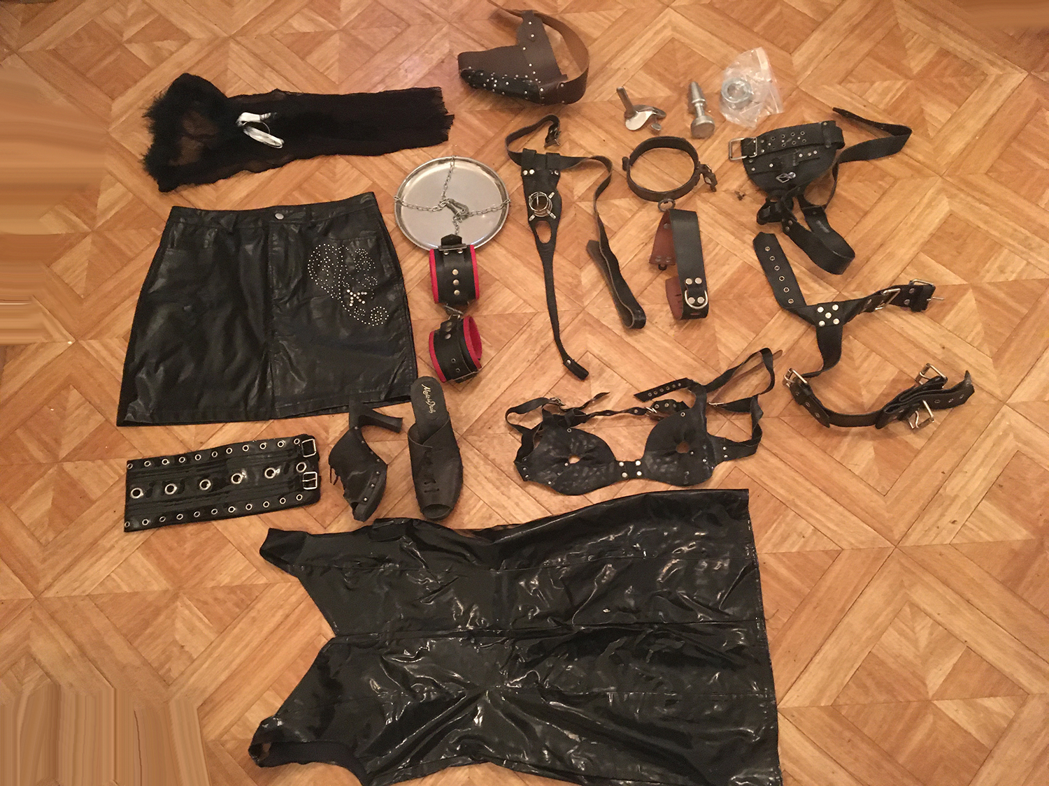 Lot 20: 1 ensemble contrainte cheville poignet en latex noir, 1 paire de menotte metal, 1 robe en cuir et clous noir a moi taille 38, 1 paire de cuissarde en latex noir taille 37, 1 haut corset noir en satin taille 44, 1 jupe latex noir fermeture eclair taille 38 a moi, 2 plug metal crome, 1 cage de chasteter petite taille en crome, 1 plug latex grande taille, 1 contrainte cheville poignet tres ancien (collector) en fer.