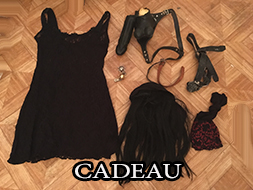 CADEAU: 1 gode ceinture defectueux a customisé, 1 robe noir dentelle taille unique, 1 perruque noir, 1 paire de bas, 1 baillon boule,