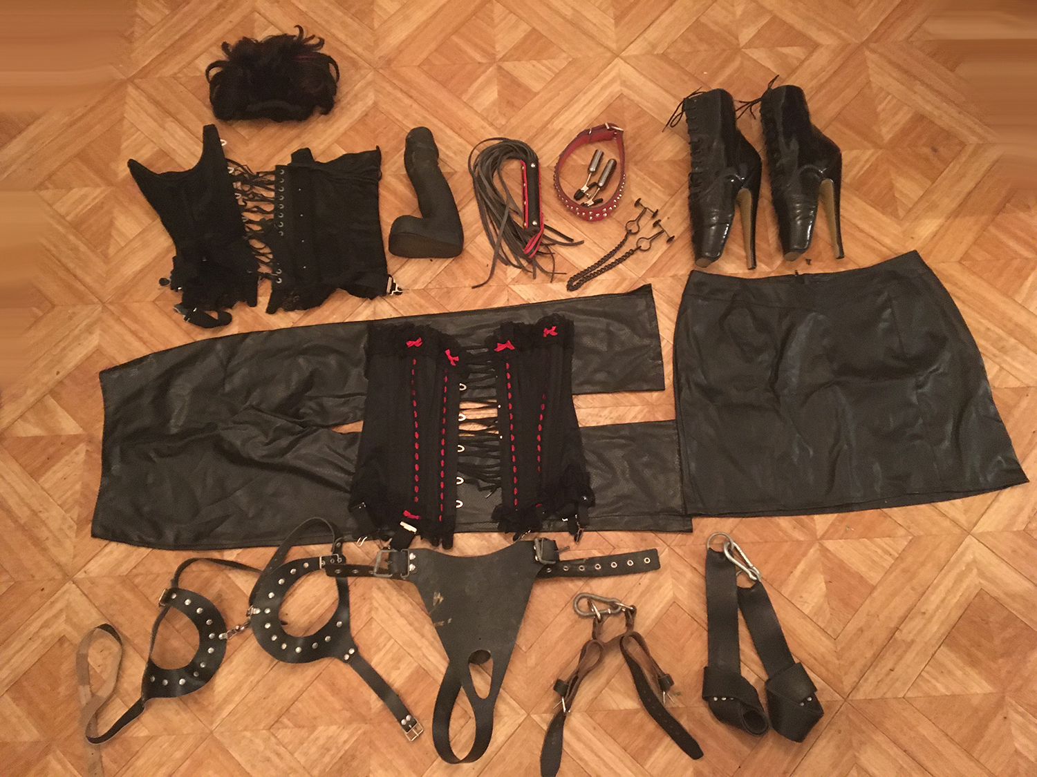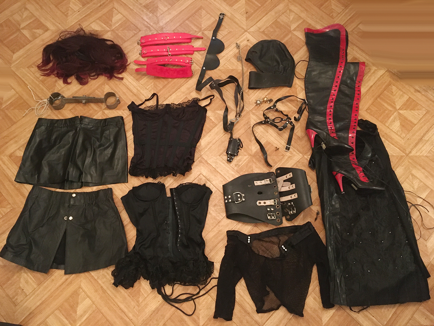Lot 14: 1 perruque courte 1 paire de menotte poignet cheville rouge, 1 masque cuir noir, 1 cagoule noir cuir, 2 mini jupe cuir noir taille 42/44, 2 corset satin taille 42/44, 1 petit haut resile noir taille unique, 1 corset latex defectueux, 1 tablier vinyle noir, 1 contrainte bouche a laniere cuir noir, 1 cage sexe en cuir noir, 2 petit poids, 1 magnifique paire de cuissarde cuir noir et rouge taille 38, 1 menotte pour poignet ou cheville d'epoque (accessoire Collector rare et precieux.)