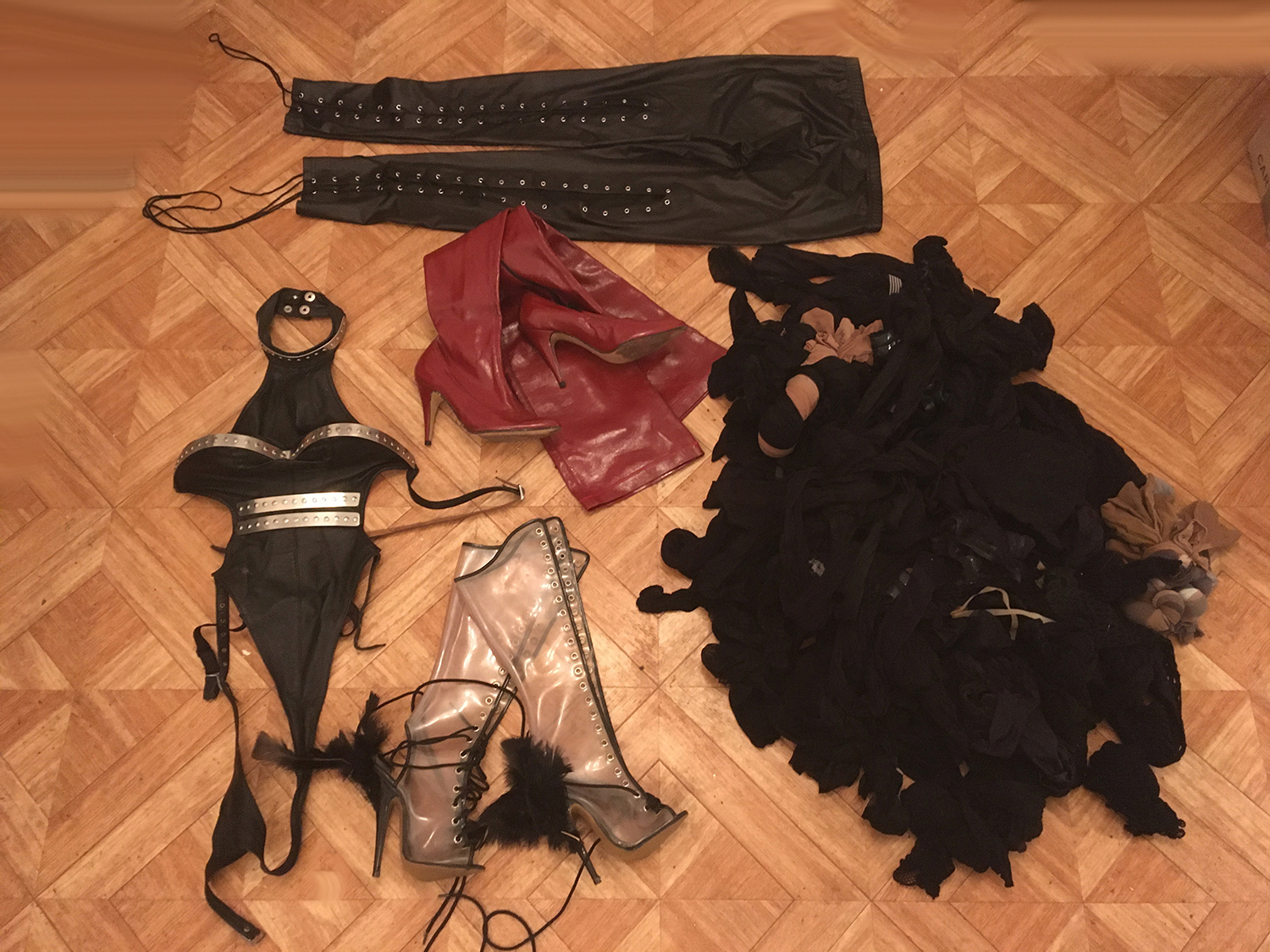 Lot 15: 1 pentalon a moi taille 38, 1 paire de cuissarde a moi vinyle rouge pointure 38, 1 paire de bottine Phylea transparente pointure 37, 1 lot de nombreux paire de bas et collant deja porter par moi. Mon magnifique body en cuir et metal Phylea taille 38 reglable.