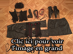 Lot 01: 1 Corset vinyle taille reglable, 1 sac vinyle, 1 paire de pince japonnix, 1 gode, 1 corde noir, 1 ceinture cuir et clous, 1 baillon boule, 1 paire d'escarpin taille 40 cuir et vinyle, un corset contrainte cuir et vinyle reglable. 1 cagoule vinyle, 1 perruque, 1 paire de bas bleue, 1 jupe en cuir taille 48, 1 slip contrainte ou pose de gode cuir taille reglable, 1 mini jupe en voile.