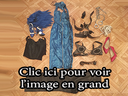 Lot 18: 1 perruque longue bleue, 1 magnifique paire de chaussure bleue pointure 37, 1 longue robe latex bleue a moi taille 38, 1 plug moyen noir, 1 paire de menotte chaine, 1 corset satin noir taille 38, 1 pentalon neuf en cuir taille 40 fermeture eclair entre les cuisse, 1 paire d'escarpin rouge en cuir pointure 39, 1 haut cuir noir et chaine grande taille et reglable, 1 baillon boule, 1 petite corde, 1 ensemble contrainte cuir et metal (d'epoque collector) poignet et cheville fermeture a cadenas.