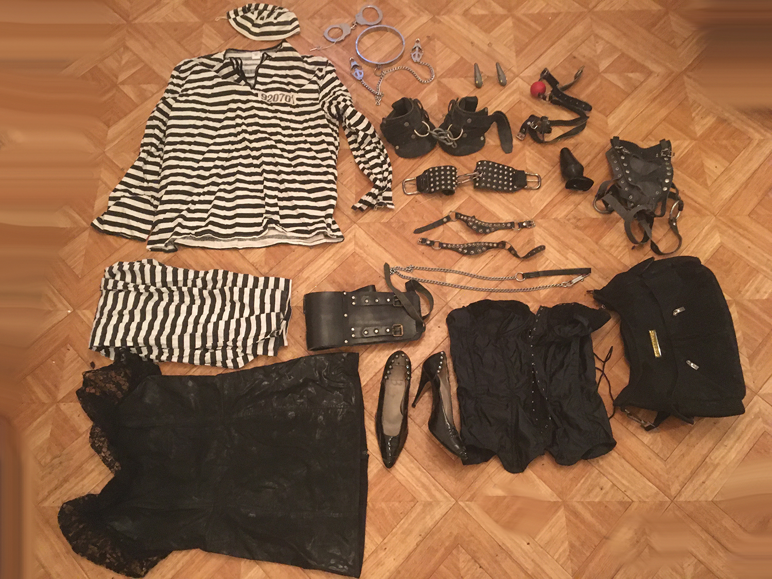 Lot 19: 1 ensemble prisonnier taille unique, 1 robe vinyle noir taille 44, 1 paire d'escarpin noir homme pointure 43, 1 corset noir en satin taille 40, 1 ceinture cuir noir taille reglable, 1 sac a main noir, 1 magnifique collier metal crome a pince neuf, 1 paire de contrainte cheville pour suspenssion en cuir noir, 1 baillon boule, 1 porte gode en cuir noir, 1 paire de menotte cuir et clous noir, 1 laisse, 2 fantaisie pour bottine en cuir et noir a clous, 1 plug noir taille moyenne, 1 paire de menotte metal, 2 poids, 1 contrainte sexe en lanniere cuir noir.