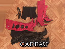 CADEAU: 1 DVD SM, 1 masque cuir noir, 1 serre taille noir taille 38, 1 paire de cuissarde rouge vinyle a lacet rouge pointure 42/43, 1 paire de bottine rouge et noir pointure 6, 1 paire de cuissarde vinyle noir pointure 38