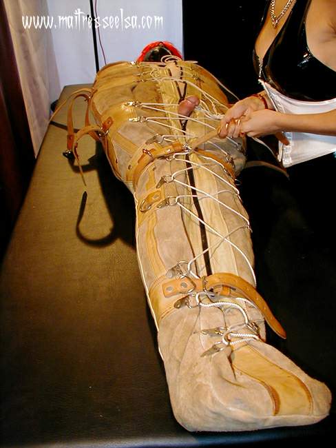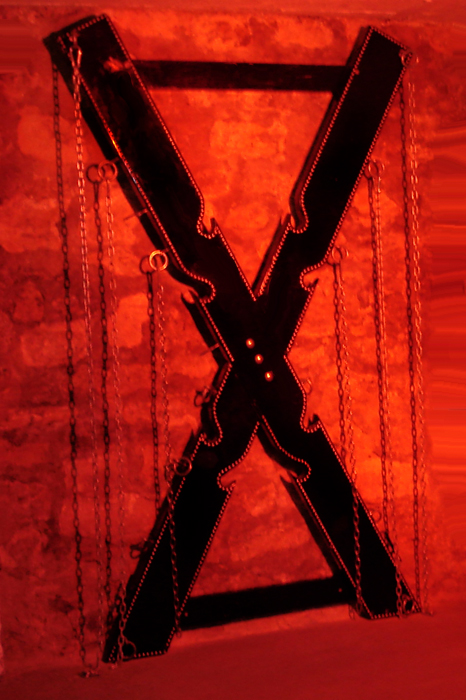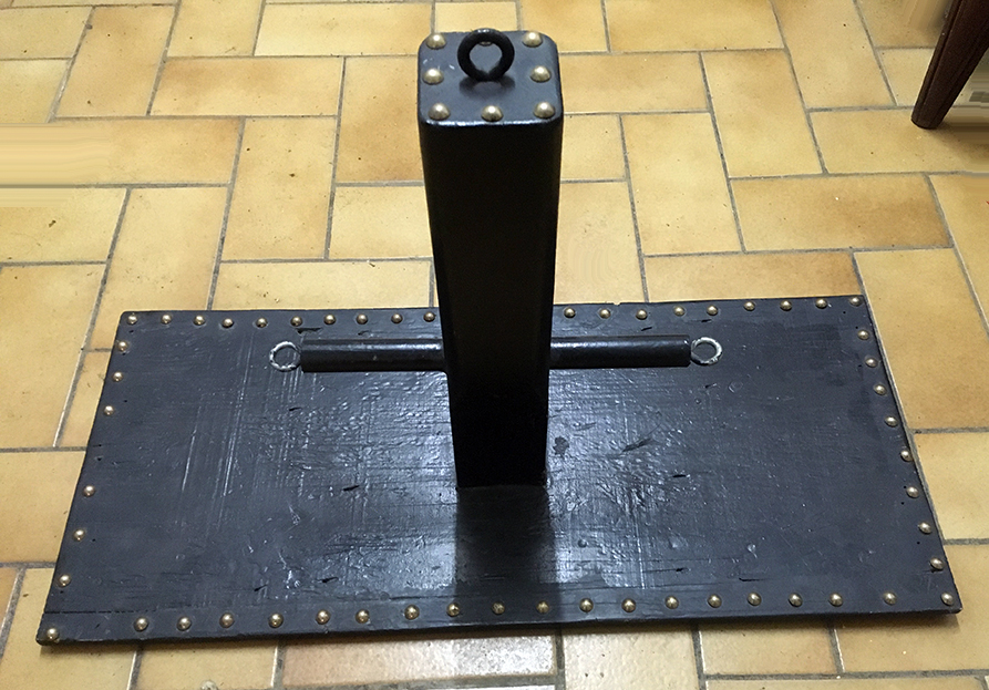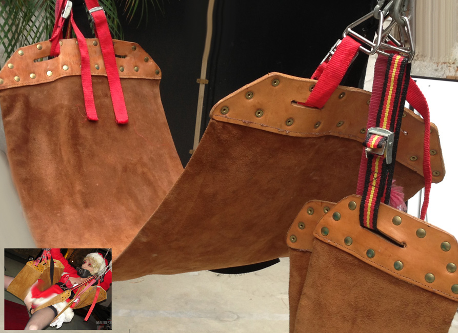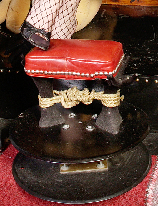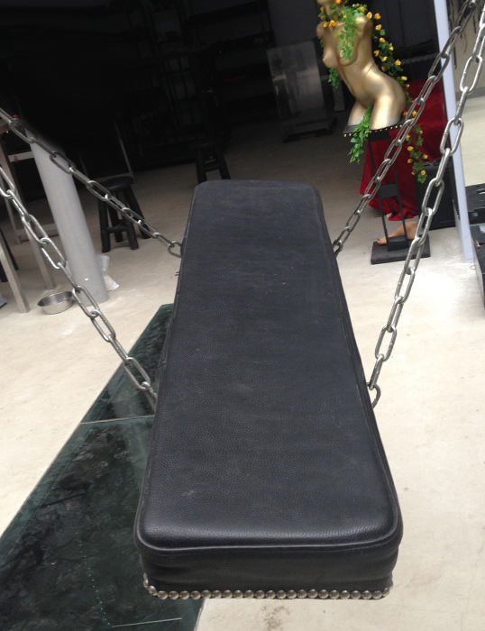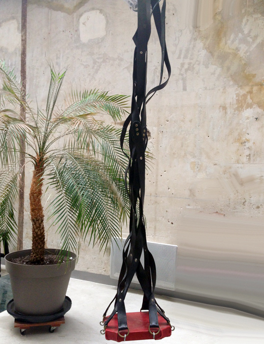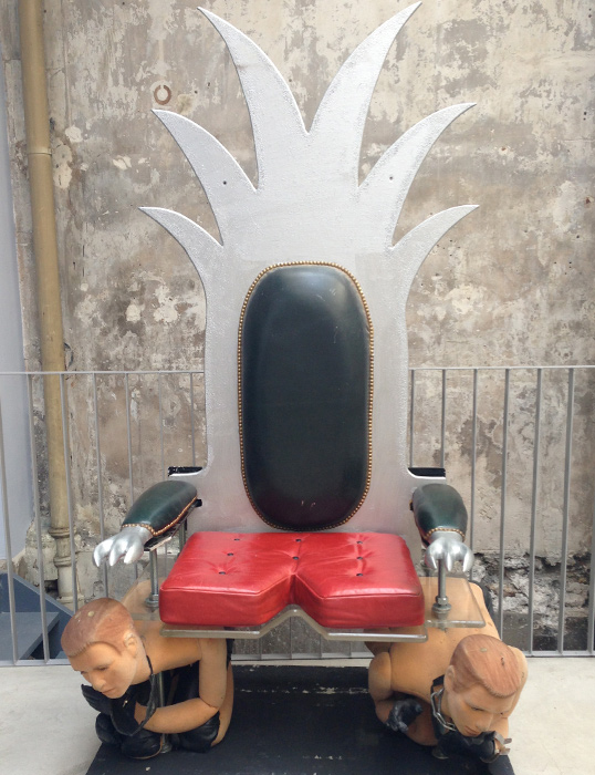 | Trone cuir, bois, plexi. Les manequins en mousse sont vieux. L110 - P85 - H217 |